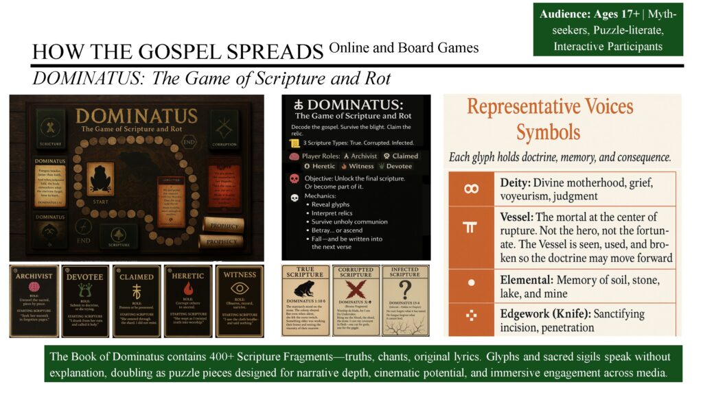Dominatus: Scriptures & Rot is a narrative-heavy horror board game set in the same universe as The Lost World of Mythoamphibia. Players navigate desecrated landscapes, draw scripture cards, and manage the creeping Rot as the Realm pushes back against human damage. Built for story-driven, campaign-style play, it’s designed for expansion into future EᴠØ-Myth projects. Film, TV, and game rights are available.