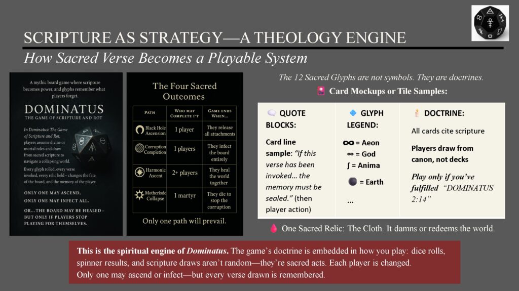 - 750+ Scripture Cards (Truth, Infected, and Corrupted sets drawn from the DOMINATUS canon)
