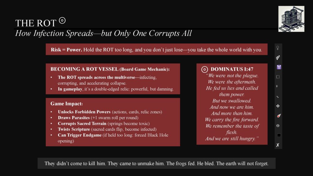 Born from the DOMINATUS novels, this game transforms scripture, ecological judgment, and mythic law into a tactical experience. Players draw ancient fragments, trigger Realm reactions, gather relics, and battle Rot as the Multiverse shifts with every choice.