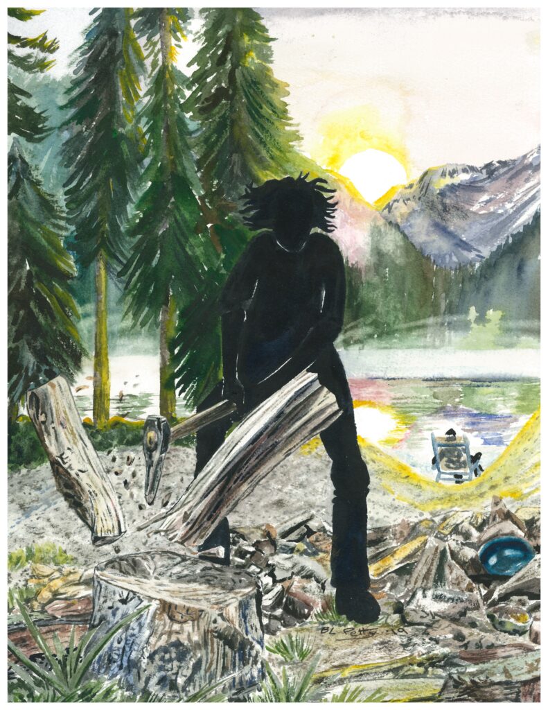 Brutus swings the axe, but it’s not just the wood splitting. Each strike is a release, a defiance, a struggle against something far heavier than the blocks beneath him. Behind him, Billy lounges in the sun, unmoving, marinating in something quieter, something unspoken. The lake glows, the air hums with the last warmth of the day—but in Brutus’s hands, the weight lingers, demanding to be broken.