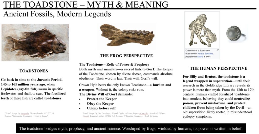 • Creation’s lesson: When human appetite corrupts the well of life, evolution answers with conscience. Through toxin and prophecy, the amphibians inherit the burden of repair—crossing species, crossing sin, daring to love where pollution divides. In Crown Hyla, queen of the Columbian spotted frogs, and the Shard’s contagion, creation proves it will not die quietly; it will adapt, remember, and reclaim the right to care for itself.
